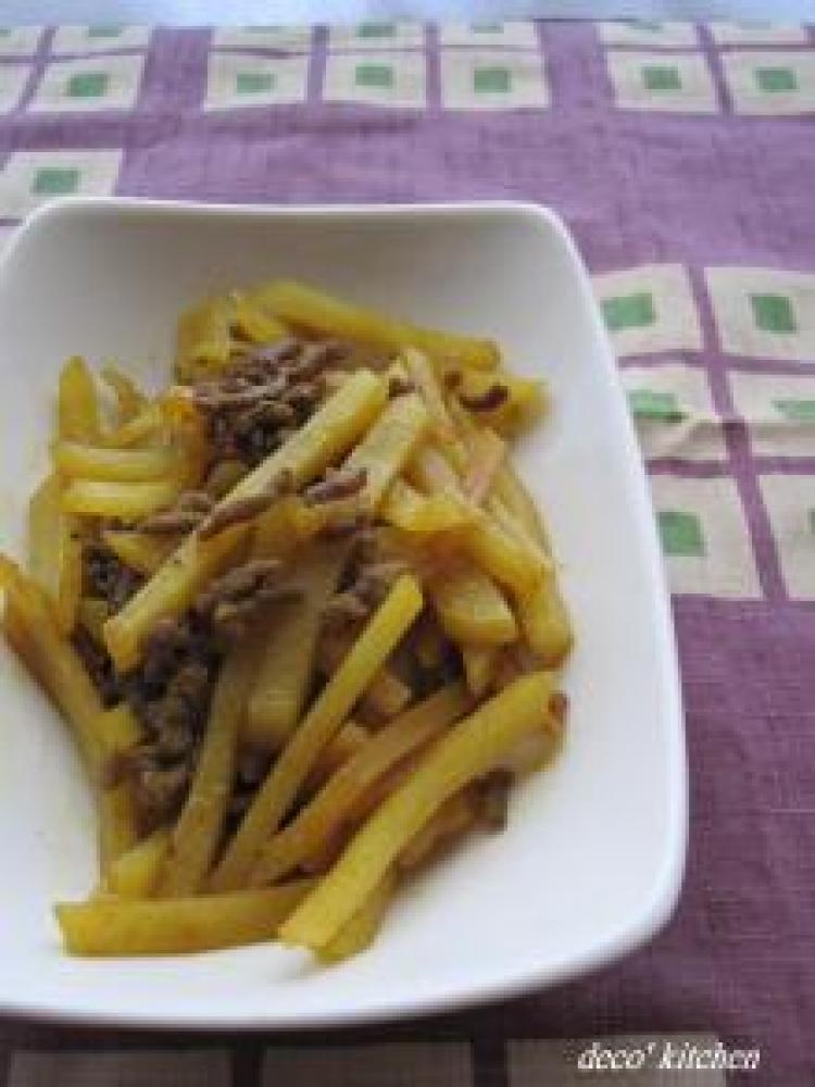 じゃがいもの色が透き通ったら、★の調味料を、上から順に加え炒める。焦げないよう気をつけながら、汁気がなくなるまで炒め完成