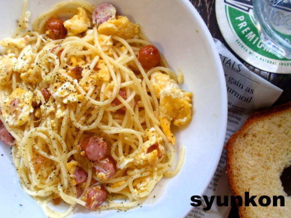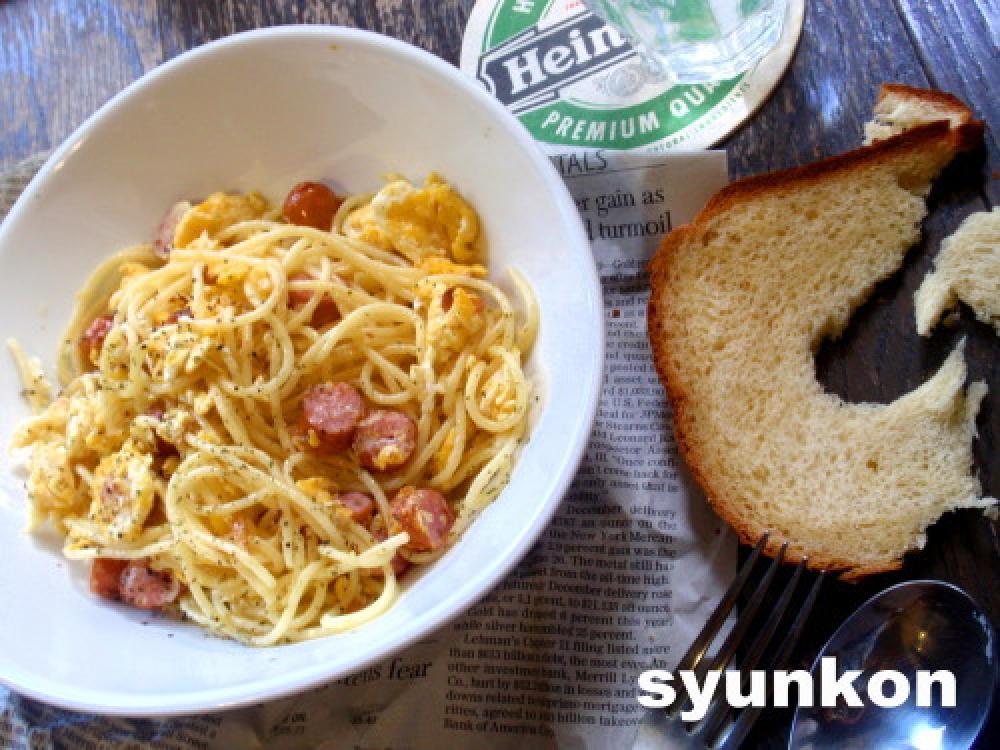 ![]() スパゲッティと、茹で汁を大さじ1~2ほど加えて全体を絡める。