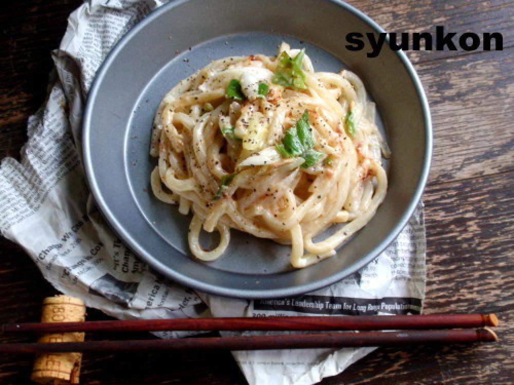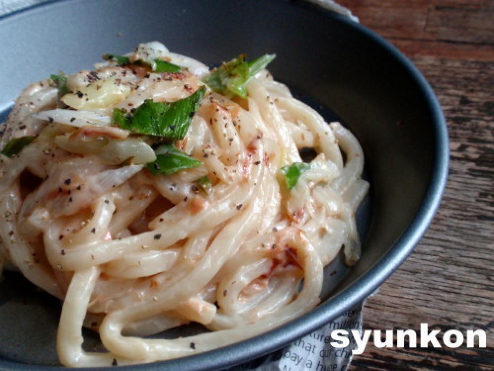 しんなりしたらうどんを入れて炒め、ホワイトソースとカツオ節を投入する。