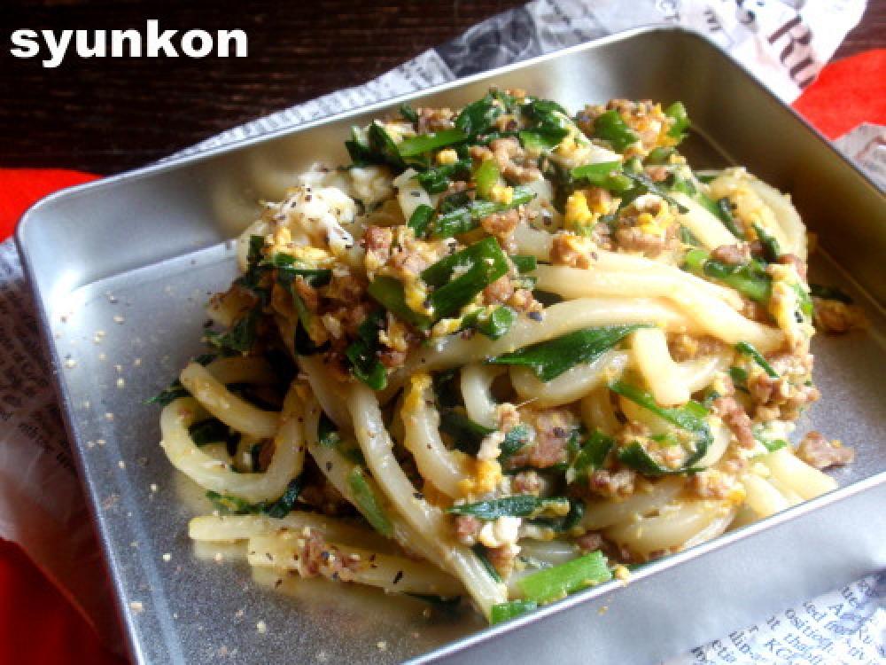 色が変わったらニラを入れ、くたっとしたらうどんを入れ、Aを加え、絡める。うわ、3行や。