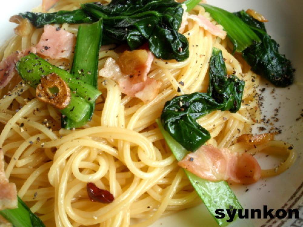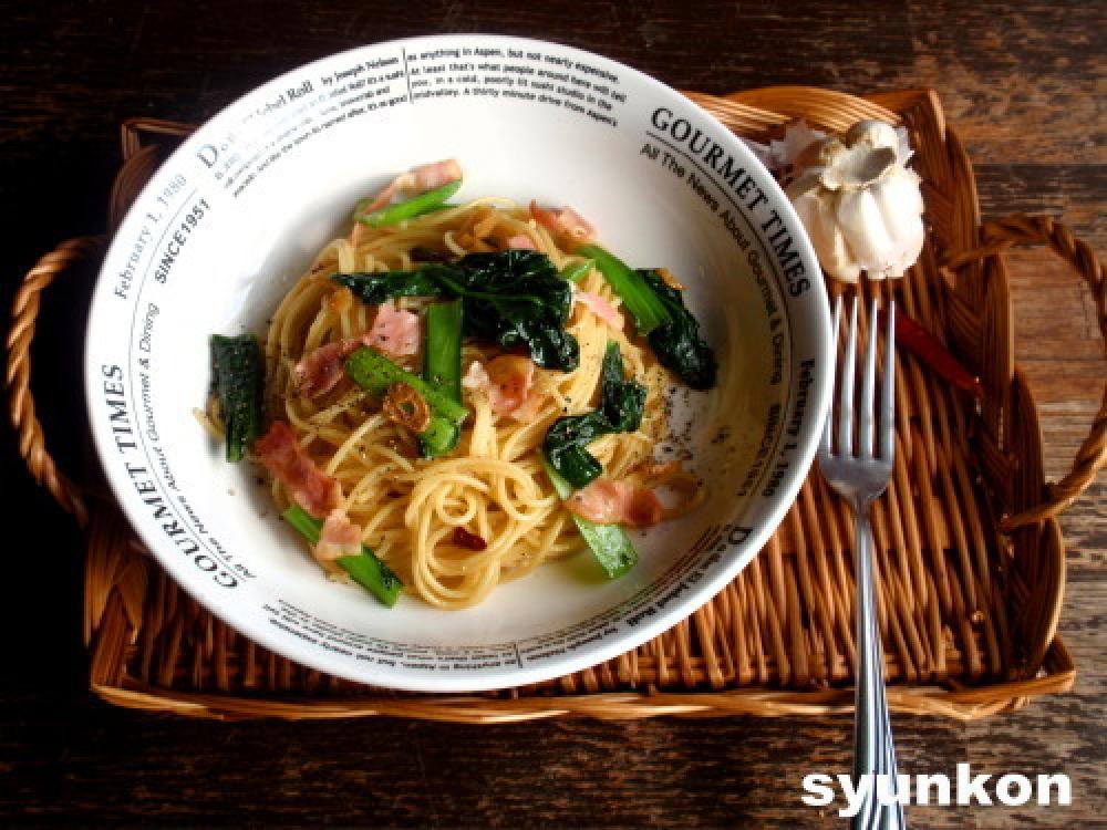 さっきのフライパンを火にかけて鷹のつめをいれ、ベーコンと小松菜を炒める。