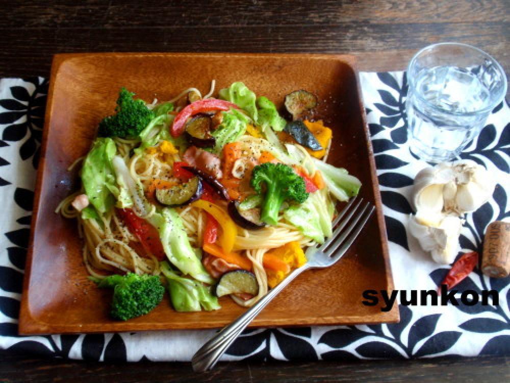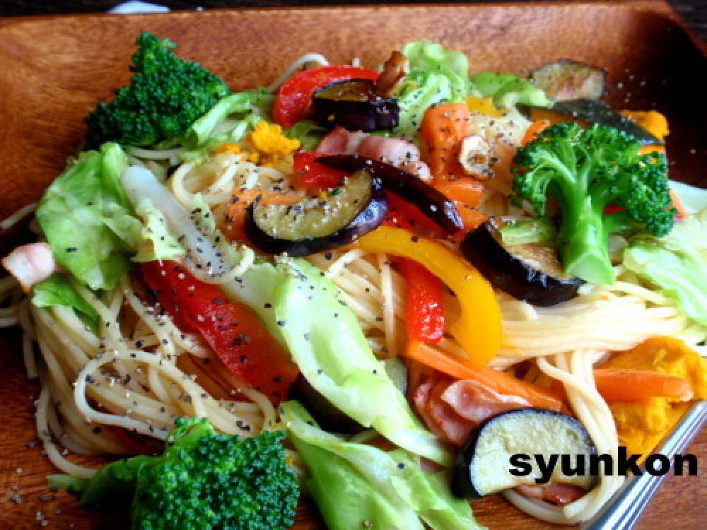 ほんでにんじんとパプリカ、キャベツも加えて炒め、ブロッコリーとかぼちゃも投入し、塩・こしょうする。