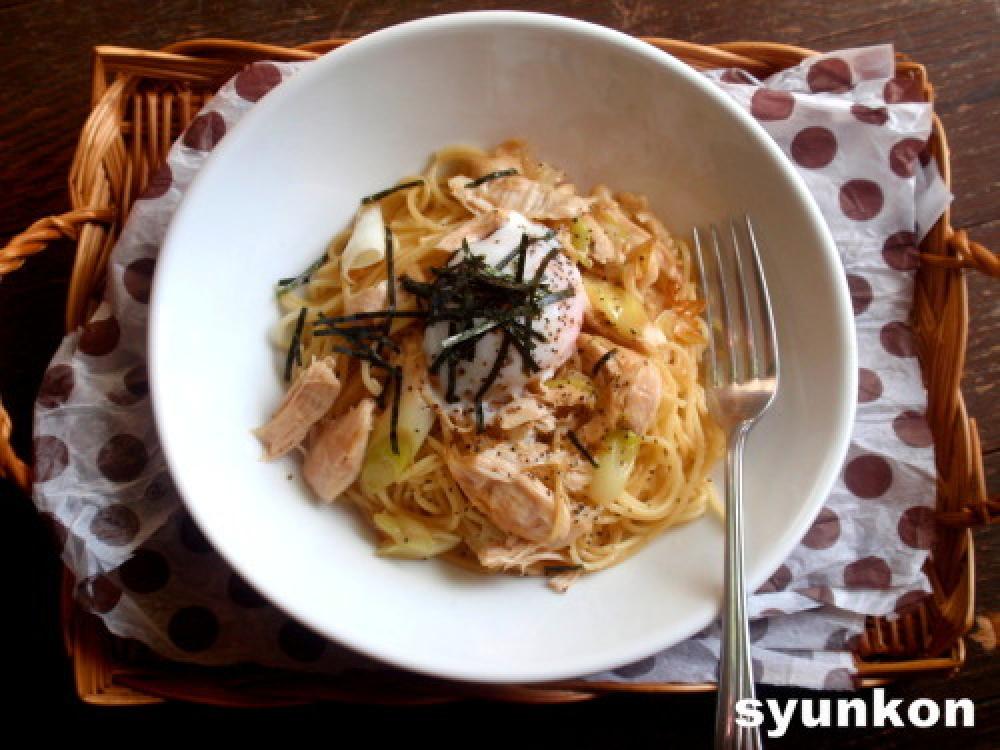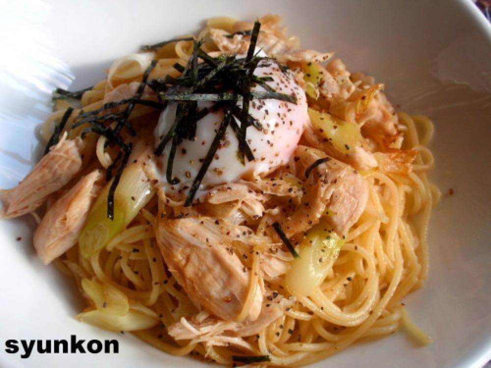 スパゲッティは袋の表示通りに茹ではじめ、ささみも加えて一緒に茹でる。茹で汁は大さじ3ぐらいとっておく。