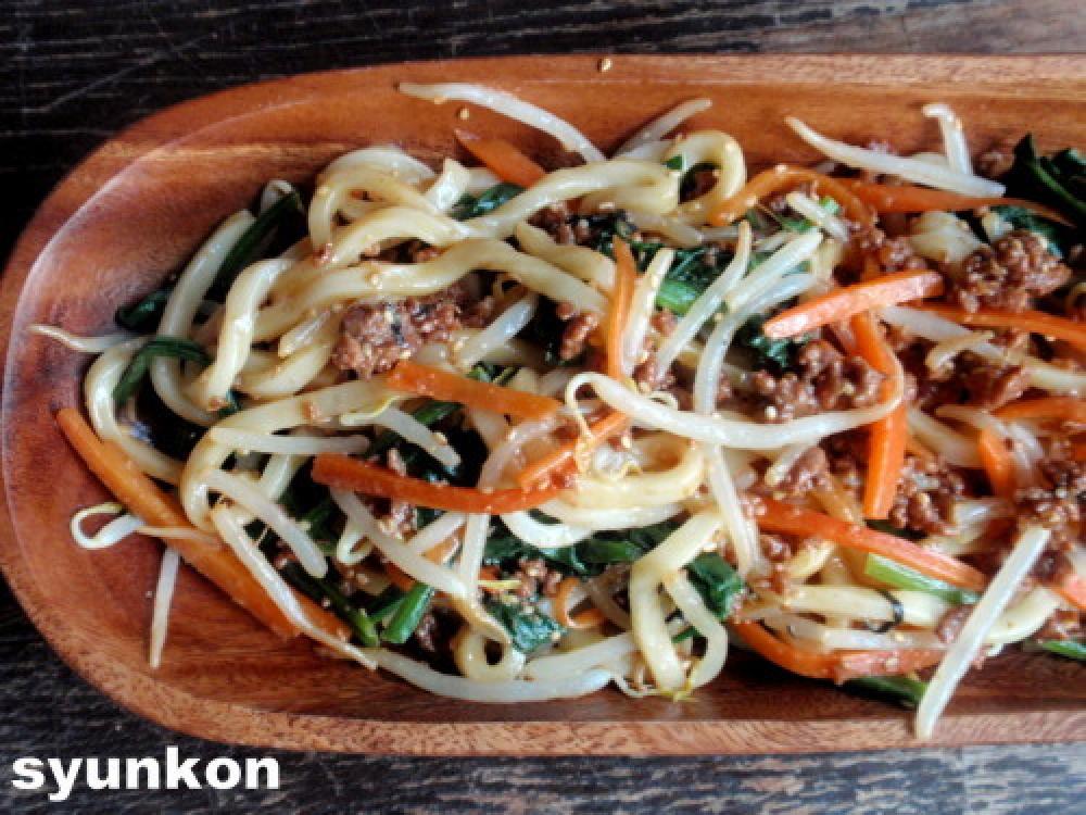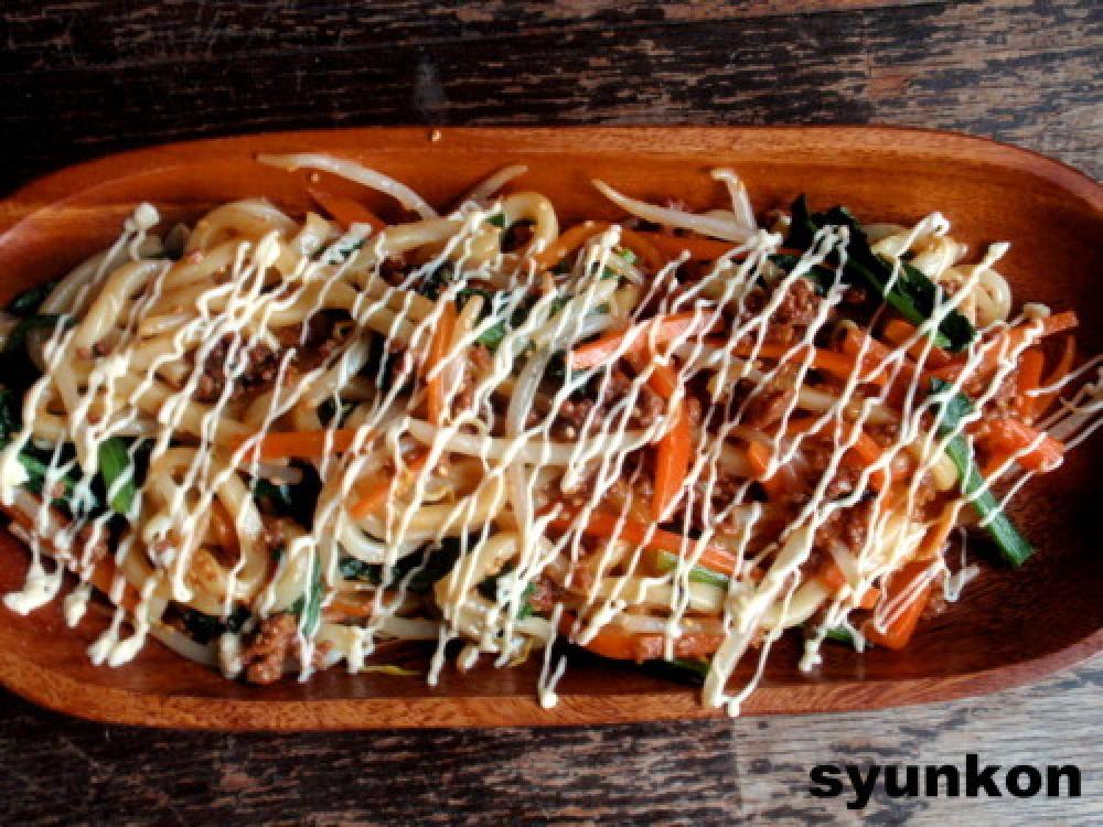 ![]() ボールにうどん、野菜を和えたもん、肉味噌、卵黄、白ゴマをすべてまぜあわせる。