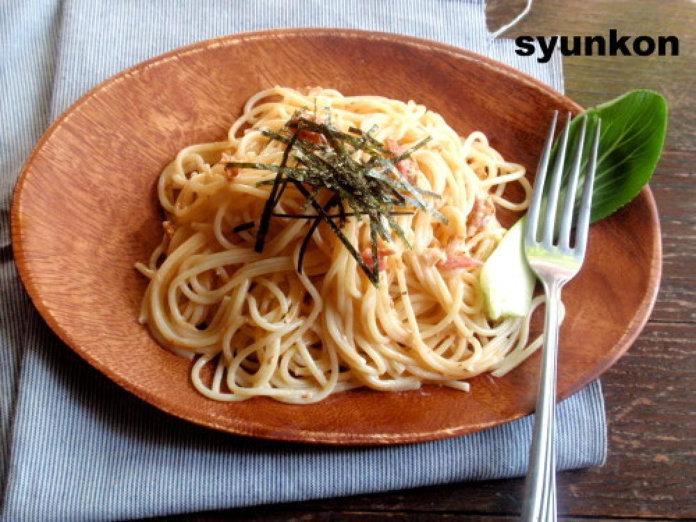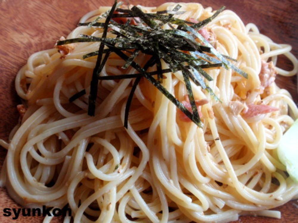 茹った麺は水でしめてからボールに加え、かつお節とゴマも加えて混ぜる。