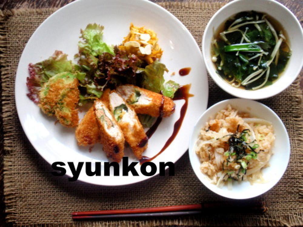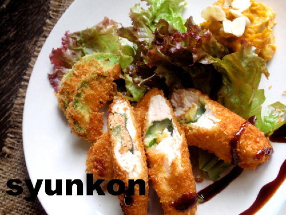 ささみは切り目をいれて開き、塩をふり、2本は大葉とチーズ、残りは大葉と明太子を挟む。