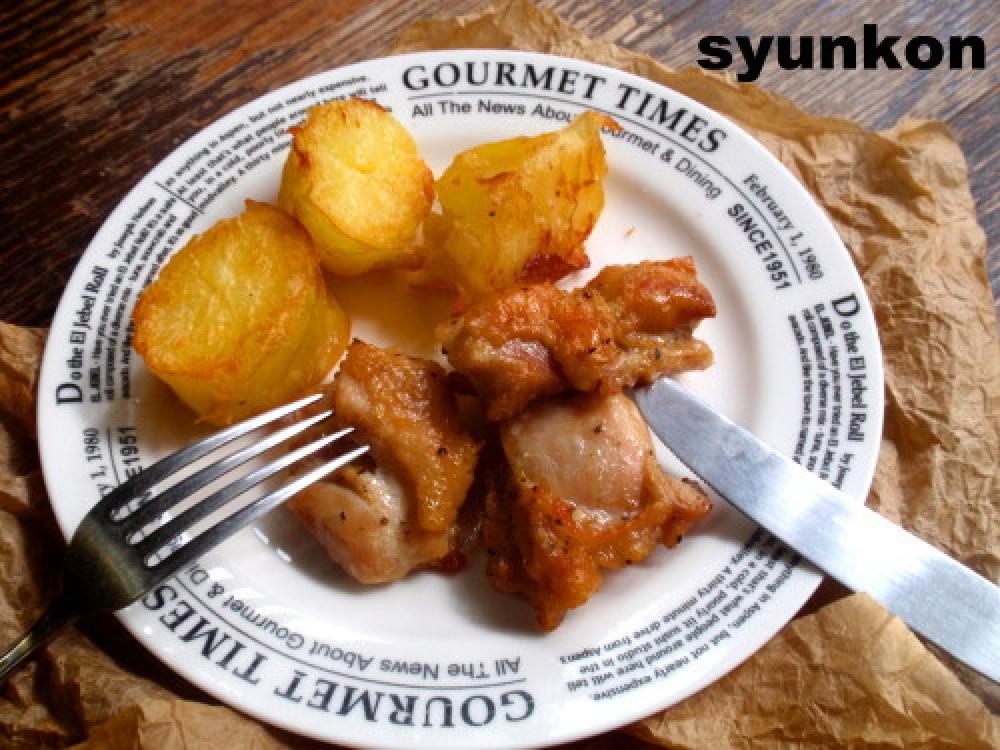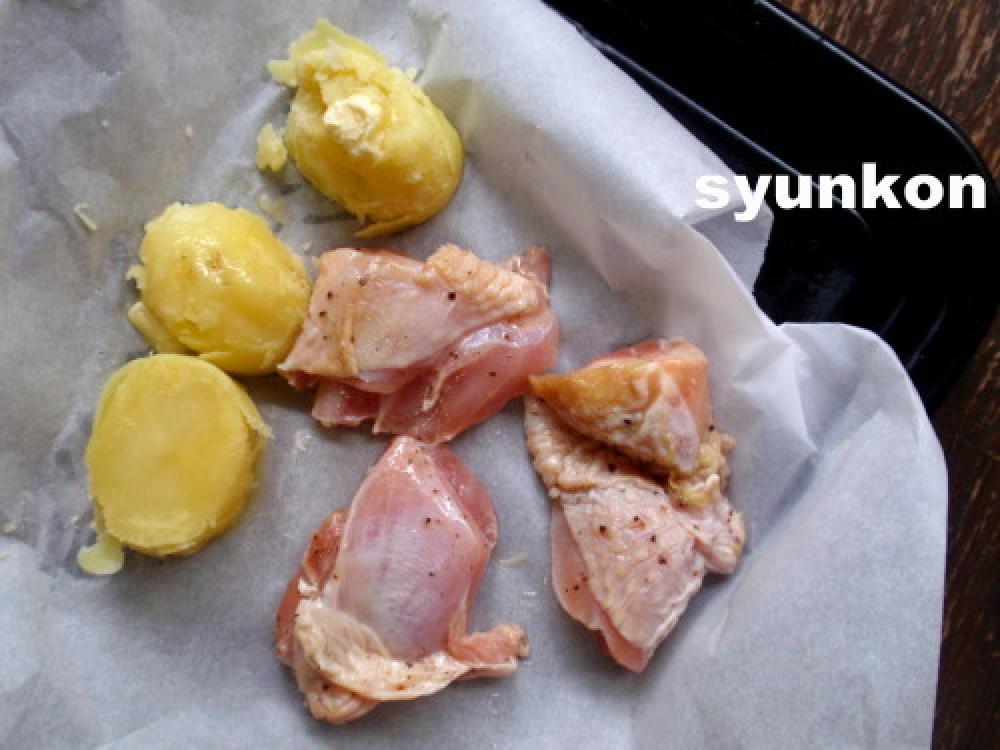 ![]() 天板にオーブンシートをしき、その上に鶏肉とじゃがいもを並べる。