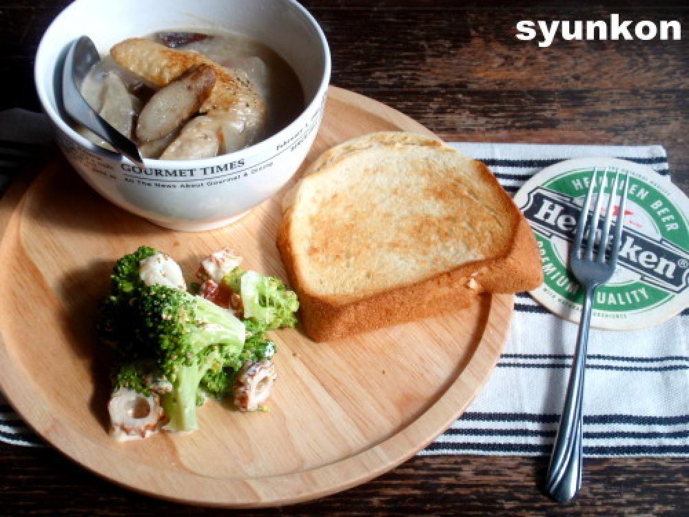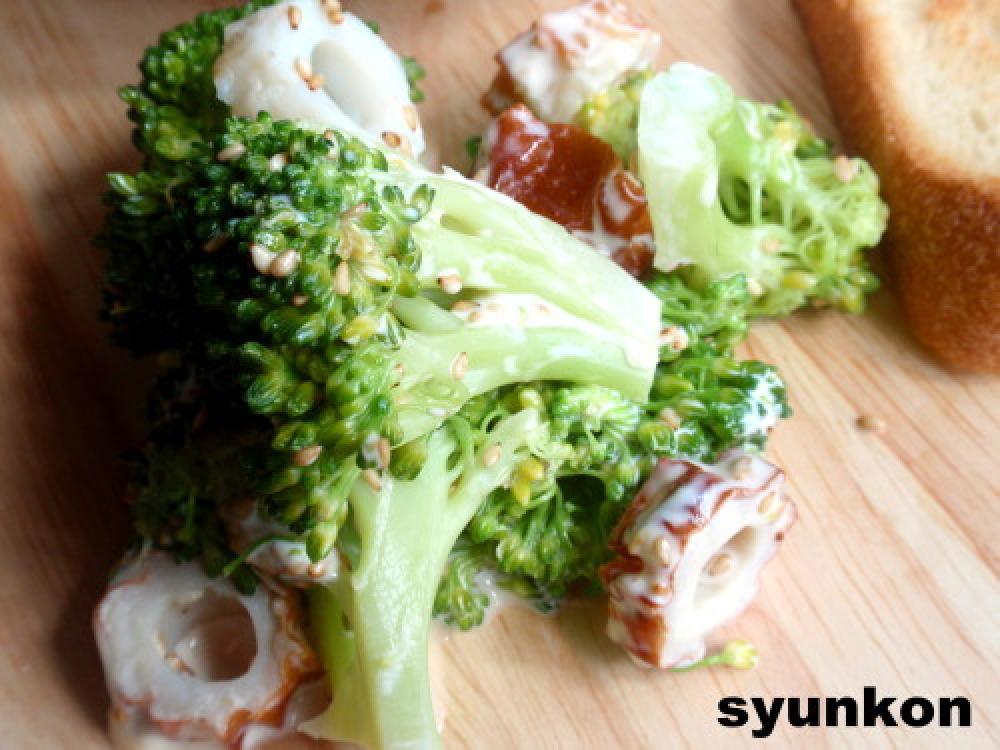 ![]() 茹でたブロッコリーとちくわを、マヨネーズ、醤油、すりゴマ、砂糖で和えるのみ。