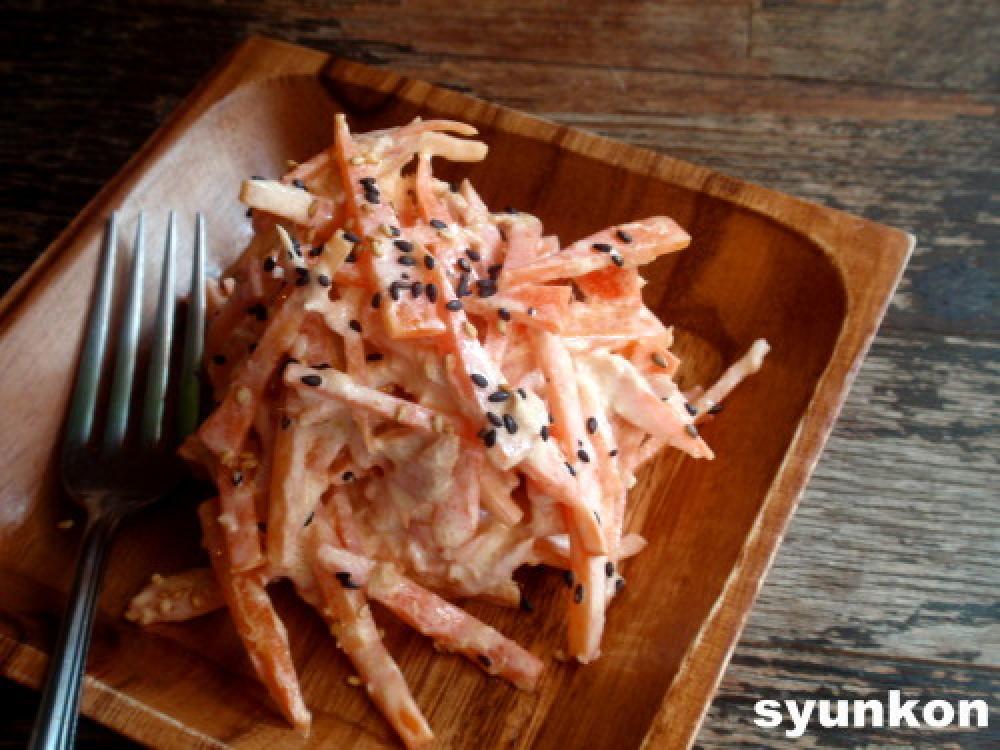 ![]() <にんじんとツナのサラダ>にんじんは細切りにしてお皿に広げ、油をちょろっとかけてラップをし、レンジで1~2分チンする。