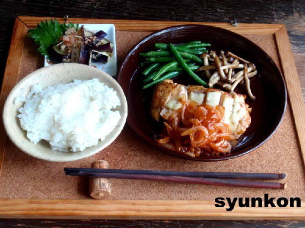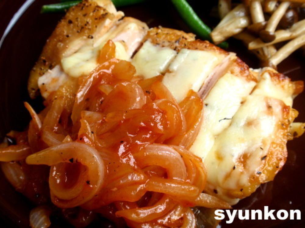 ![]() その油で玉ねぎを炒める。しんなりしたらAを絡めて、鶏に添える。そっと・・・・・