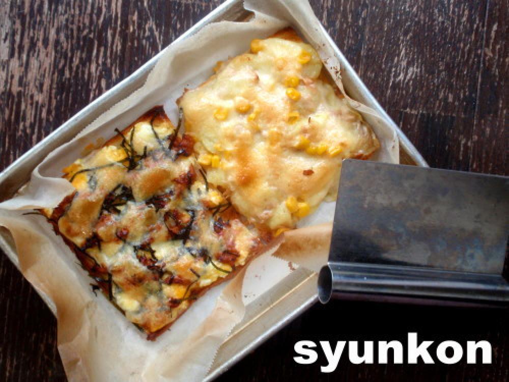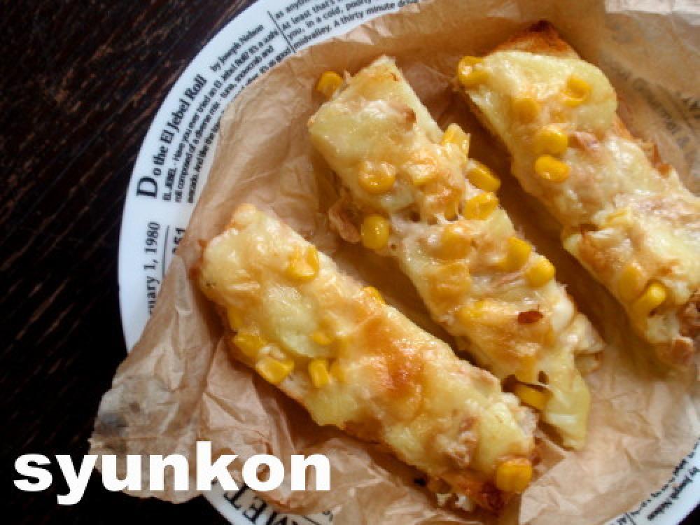 ![]() もう1つはマヨネーズで和えたじゃがいもとツナ、コーンを乗せ、チーズを乗せる。