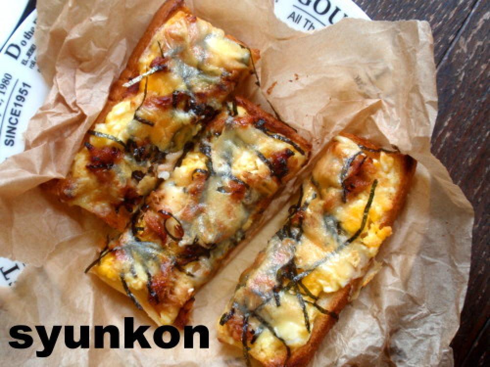 ![]() 食パンに、1つはマヨネーズで和えた卵、甘辛いツナを乗せ、海苔をちらし、チーズを乗せる。