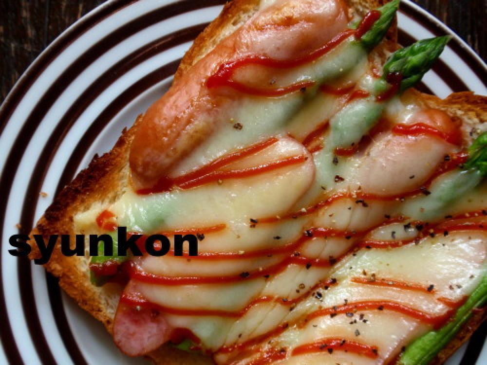 マヨネーズににんにくを混ぜて食パンに塗り、アスパラとウインナーを交互に置く。