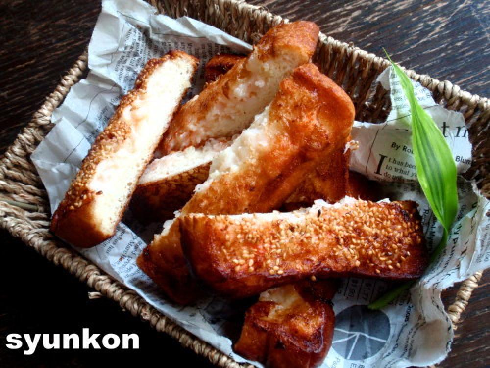 海老に食パン以外のすべての材料を混ぜて、パンに塗りつけ、ゴマをふり、油を熱したフライパンに、塗った面を下にして入れる。