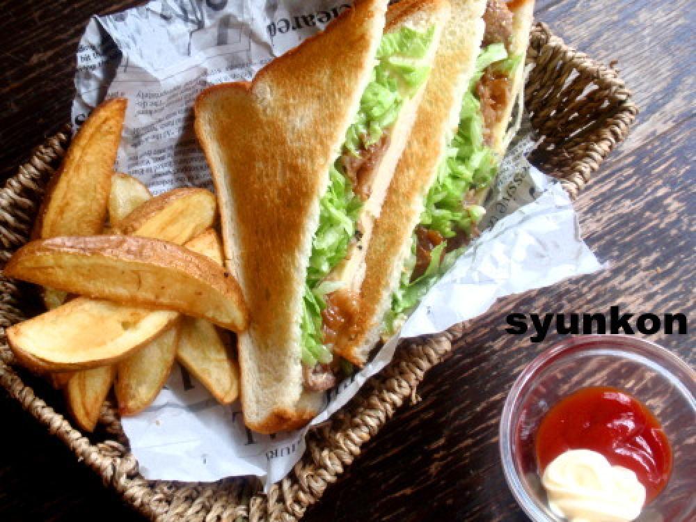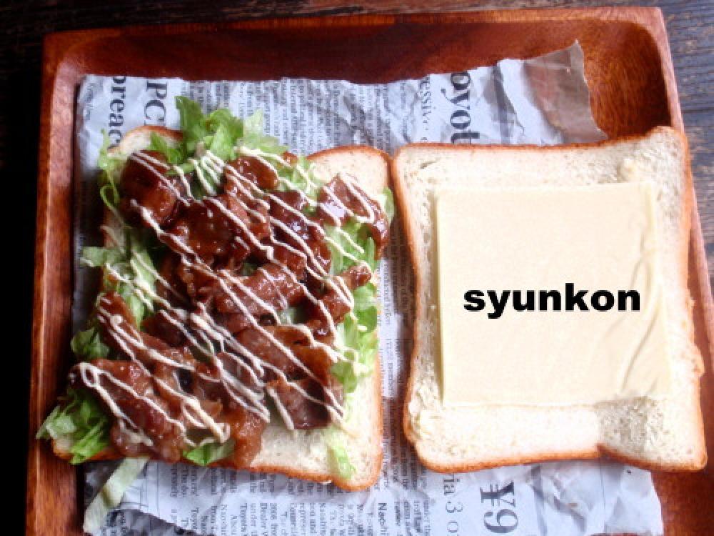 取り出してバターを塗り、チーズ、レタスの千切り、肉を挟む。