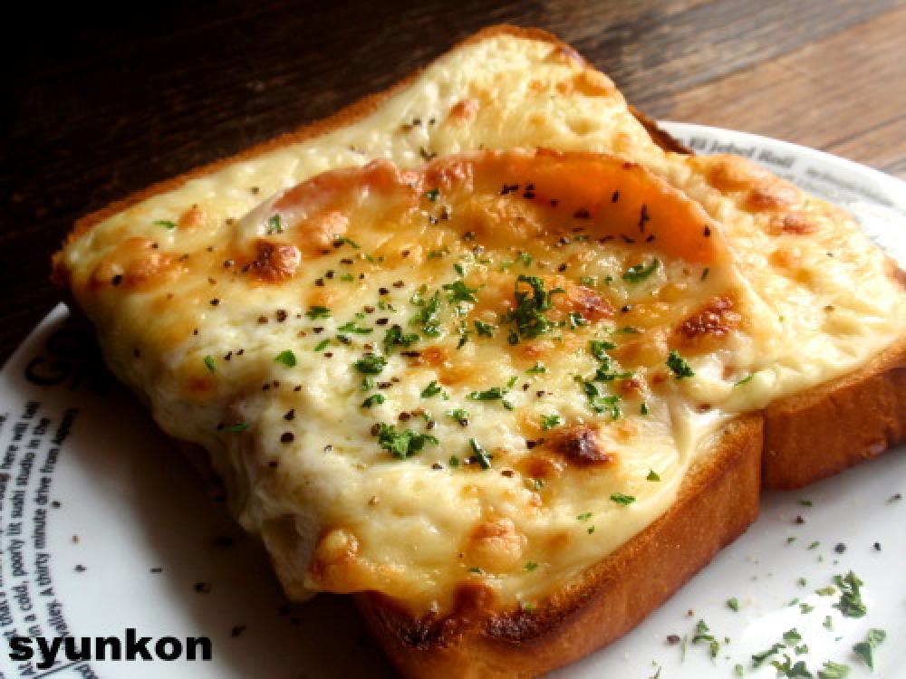 食パンにハムを4つに切って乗っけて(※ぶりーん防止策)、上からベシャメルソースを塗る。