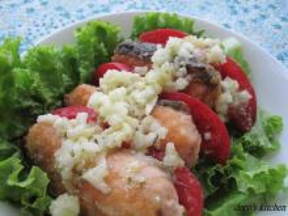 お皿にレタスをしき、鮭のソテーとトマトを交互に並べ、マリネソースをたっぷりかけて、出来上がり♪