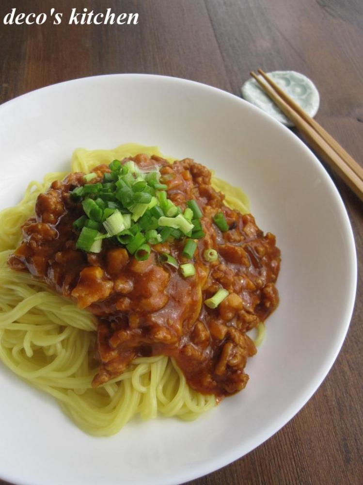 お皿に麺を盛りつけ、③の肉みそをかけて、万能ねぎをトッピングして、完成♪