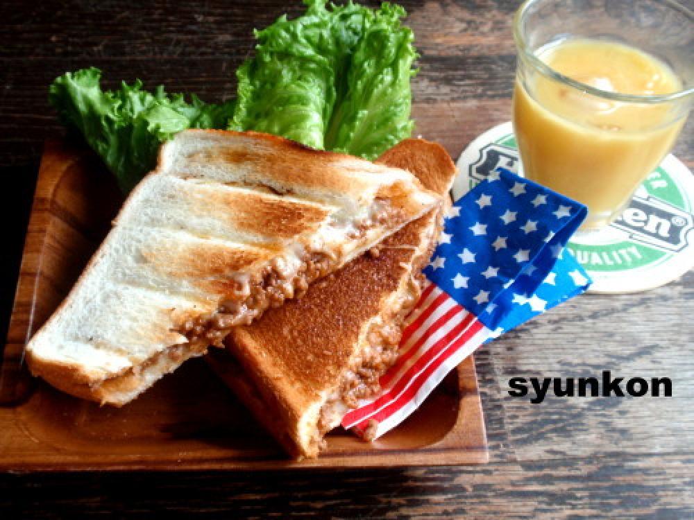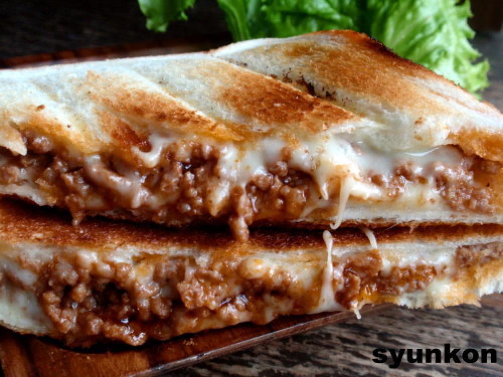 食パンにチーズをしいて、上に今の肉味噌(肉味噌!?)を乗せ、またチーズを乗せて
