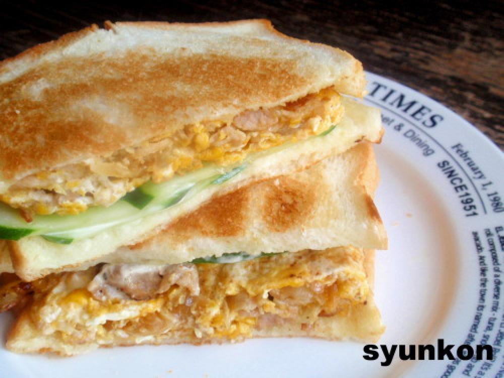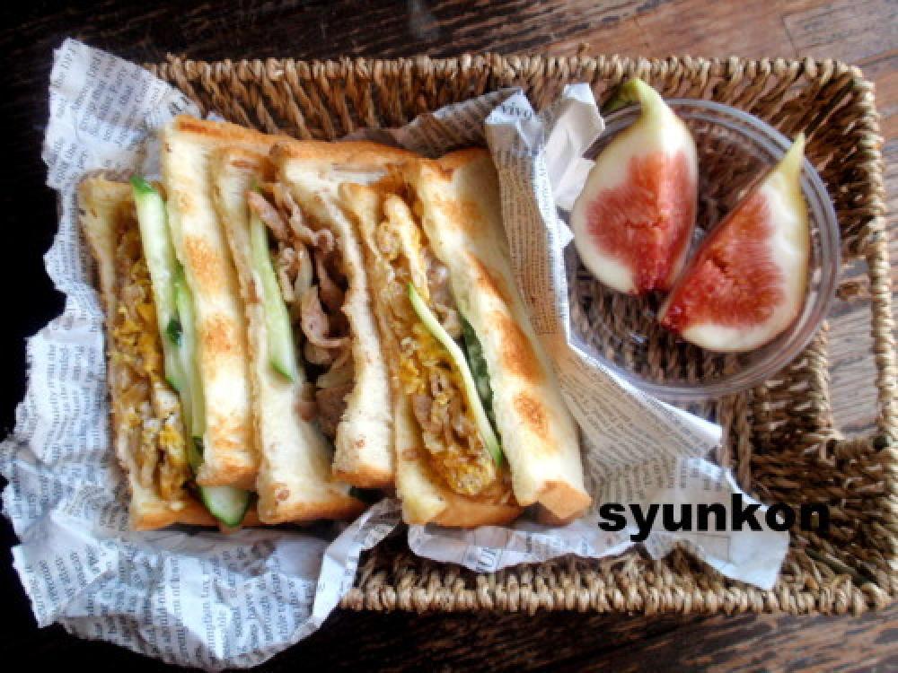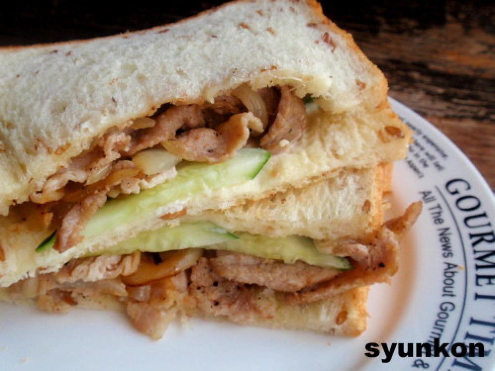![]() 食パンにマーガリンを薄くぬり、豚と玉ねぎ、きゅうりを乗せ、マヨネーズをびゃーっと。ほんで挟む。