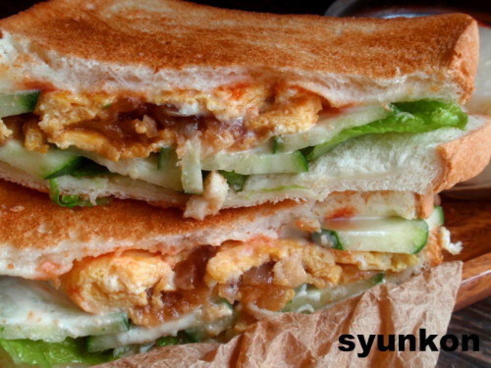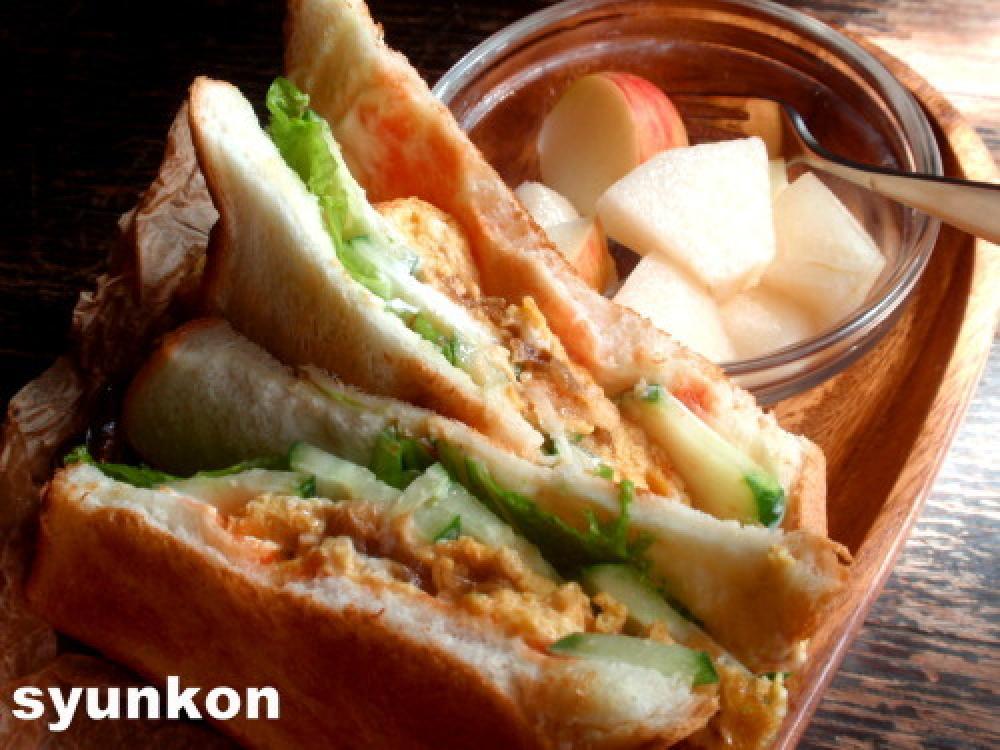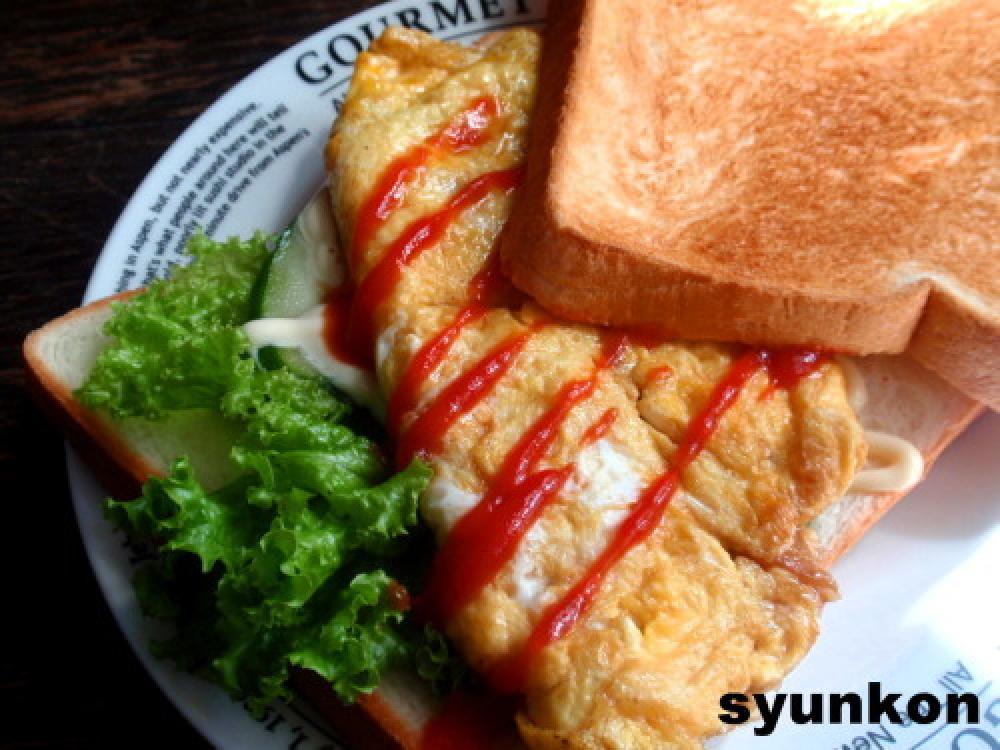 ![]() 食パンにマーガリンを好みでぬって、レタス、きゅうり、オムレツを乗せ