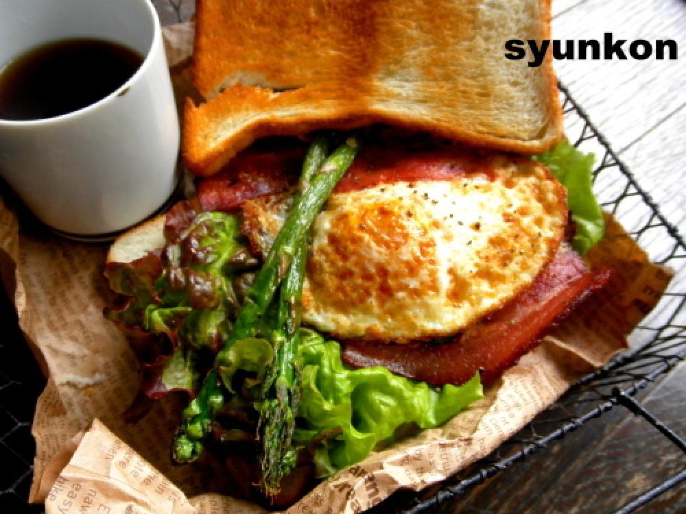 ![]() パンにマヨネーズをぬり、レタス、ベーコンエッグ、アスパラを乗せ、好みで塩こしょうをふって挟む。