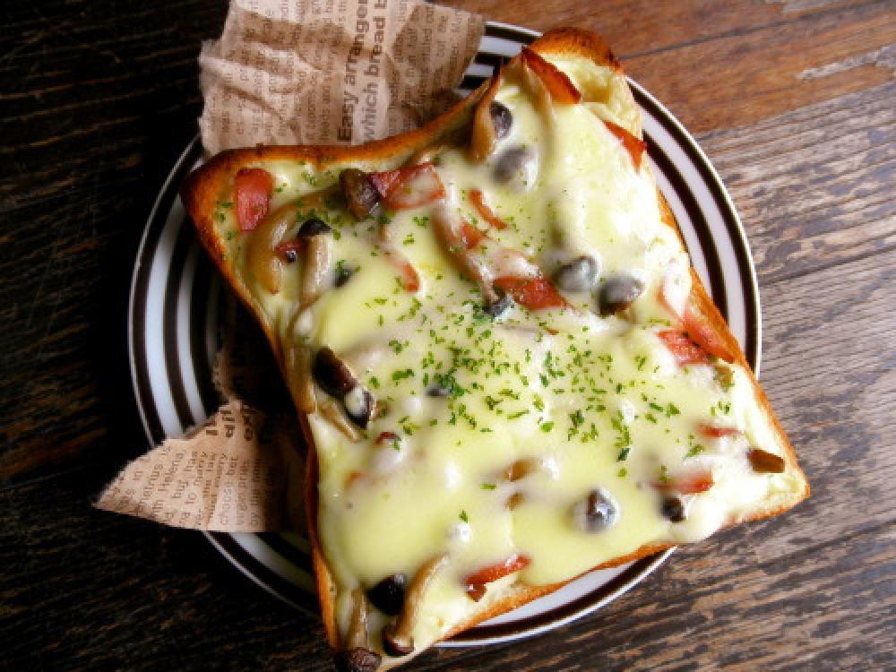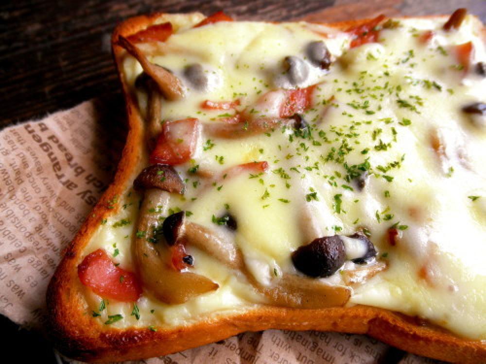 食パンにホワイトソースを塗って、しめじとベーコンを乗せて、チーズを乗せて、