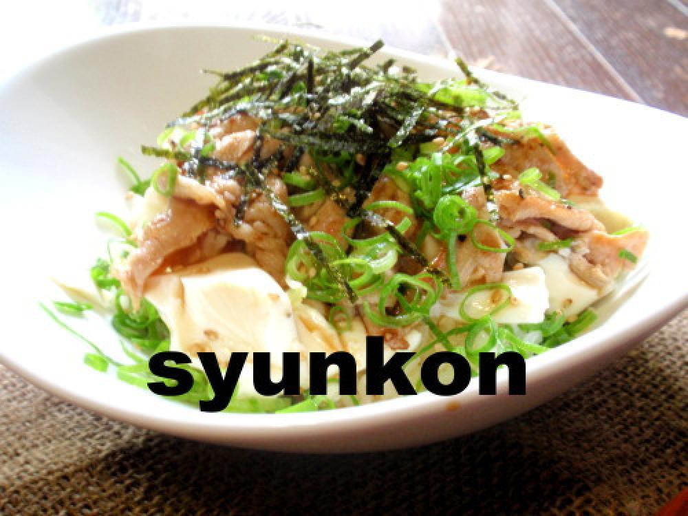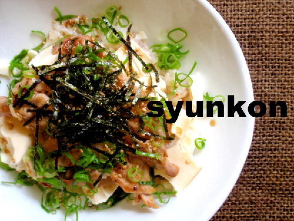 ごはんに豆腐を手で適当に崩して乗せ、豚肉を乗せ、ネギをわっさ~かけて、