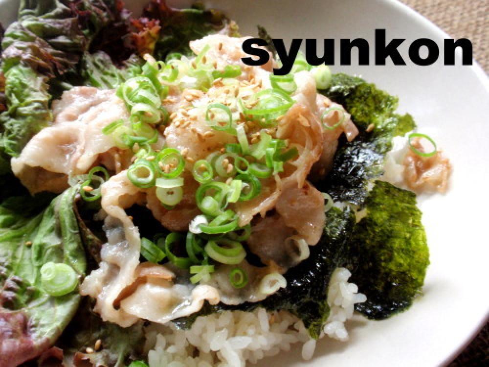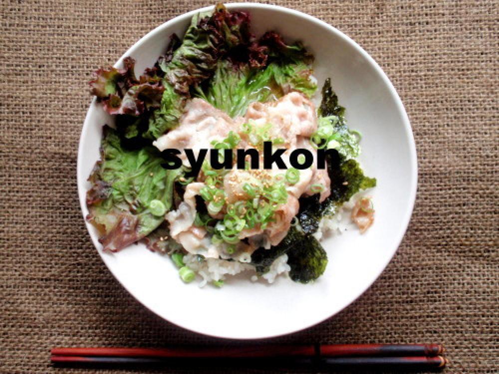 ![]() レタスと豚バラをのせ、フライパンに残った汁もかけ、トッピングをちらす。
