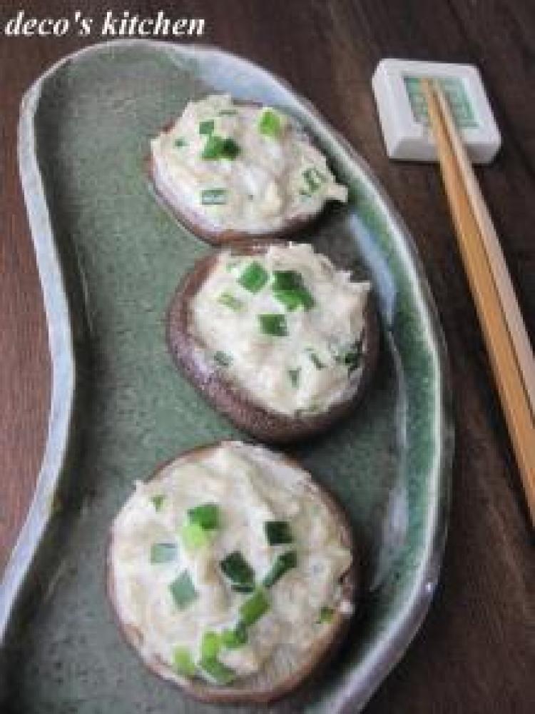 しいたけのかさの部分をきれいに残すように気をつけて石突を取る。①を6等分し、しいたけのかさの内側部分に乗せる。