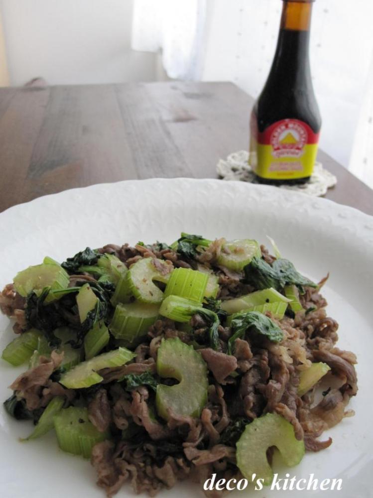 フライパンに油を熱し、牛肉を炒める。牛肉の色が変わったら、酒をふり、さらに炒める。セロリを投入し、さっと炒める。