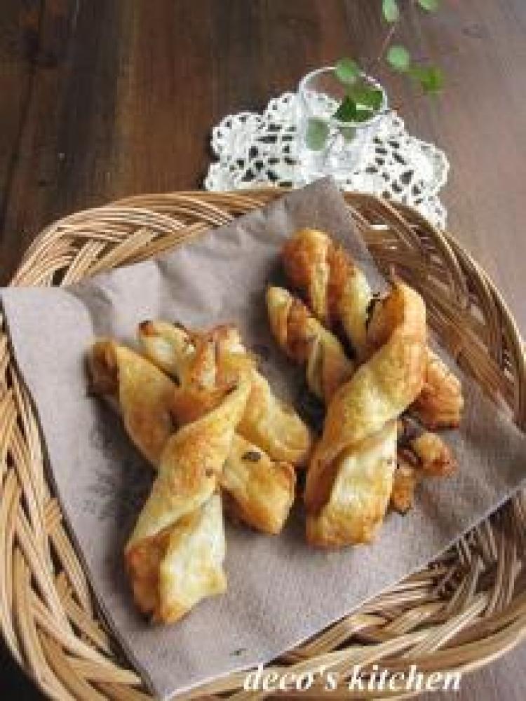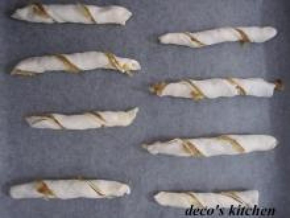 ![]() 縦に8等分し、ひねって天板に並べる。表面に溶き卵をハケで塗り、グラニュー糖をちりばめお好みでチリパウダーをひとふり。