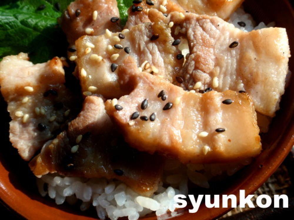 ![]() ご飯に大葉を乗せ、豚肉を油ごと乗せ、ゴマをふる。