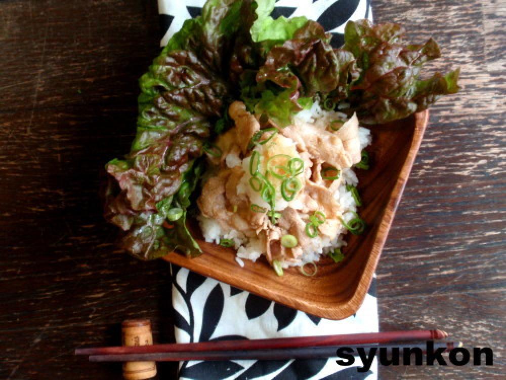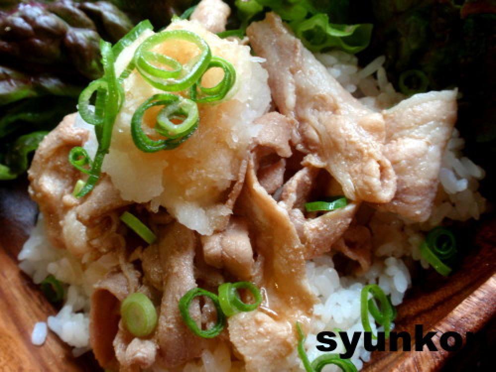 ![]() 器にご飯を盛り、豚肉を盛り、大根おろしを乗せ、Aを混ぜ合わせたタレをかけて、ネギを散らす。