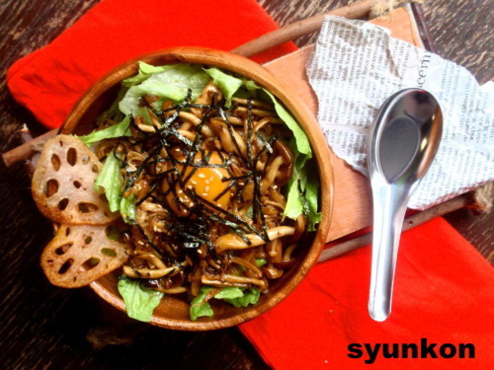 ![]() 上に炒めたきのこをたんまりと乗せ、真ん中に卵黄を落とし、刻みのりとゴマをふる。れんこんを刺す。