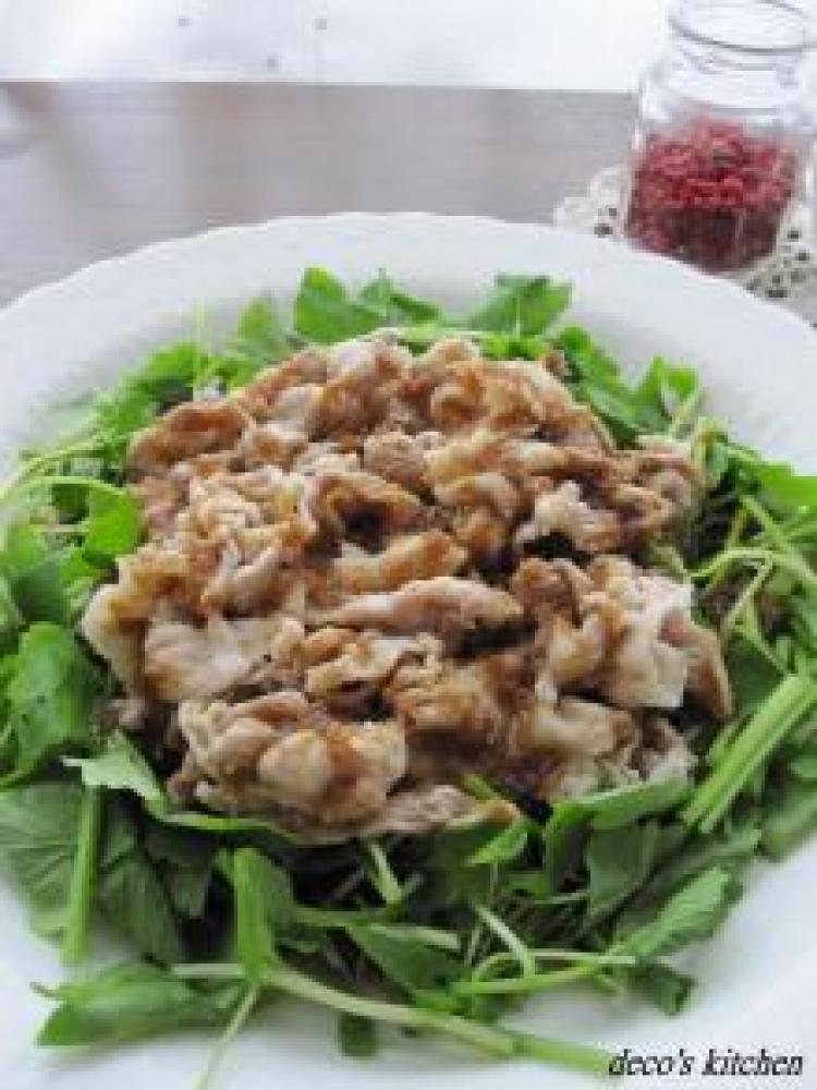 クレソンとせりは、3cmくらいの長さに切り、お皿に盛る。豚肉も盛り付ける。