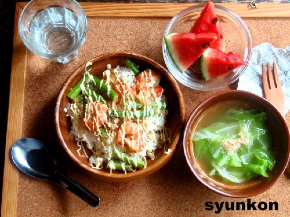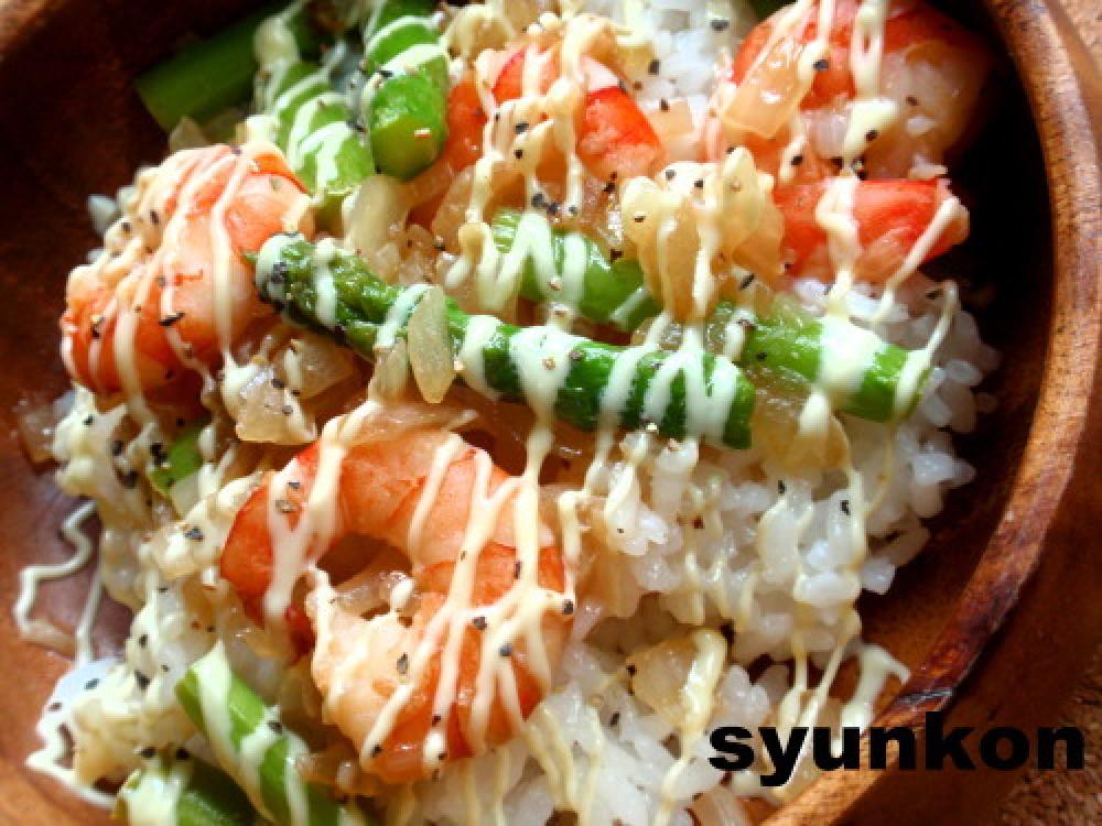 海老は殻を剥いて、Aを絡めておく。アスパラは切って茹でておく。玉ねぎはみじん切りにする。