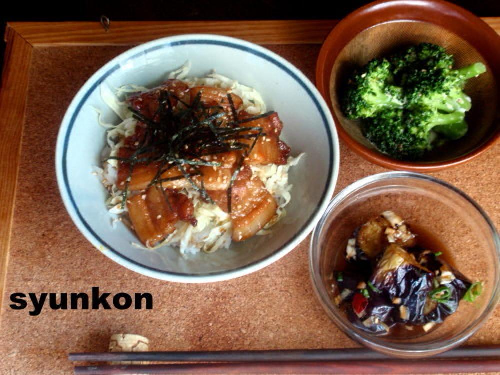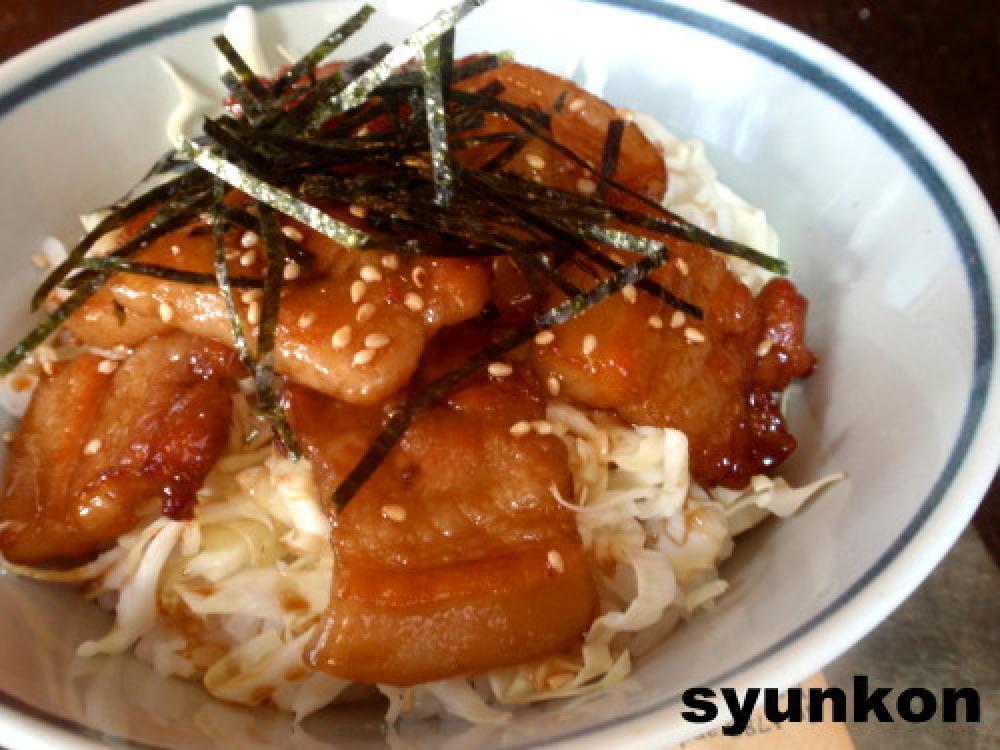ご飯の上にタレをちょっとかけてからキャベツをのせ、豚バラをのせ、さらにタレをかける。