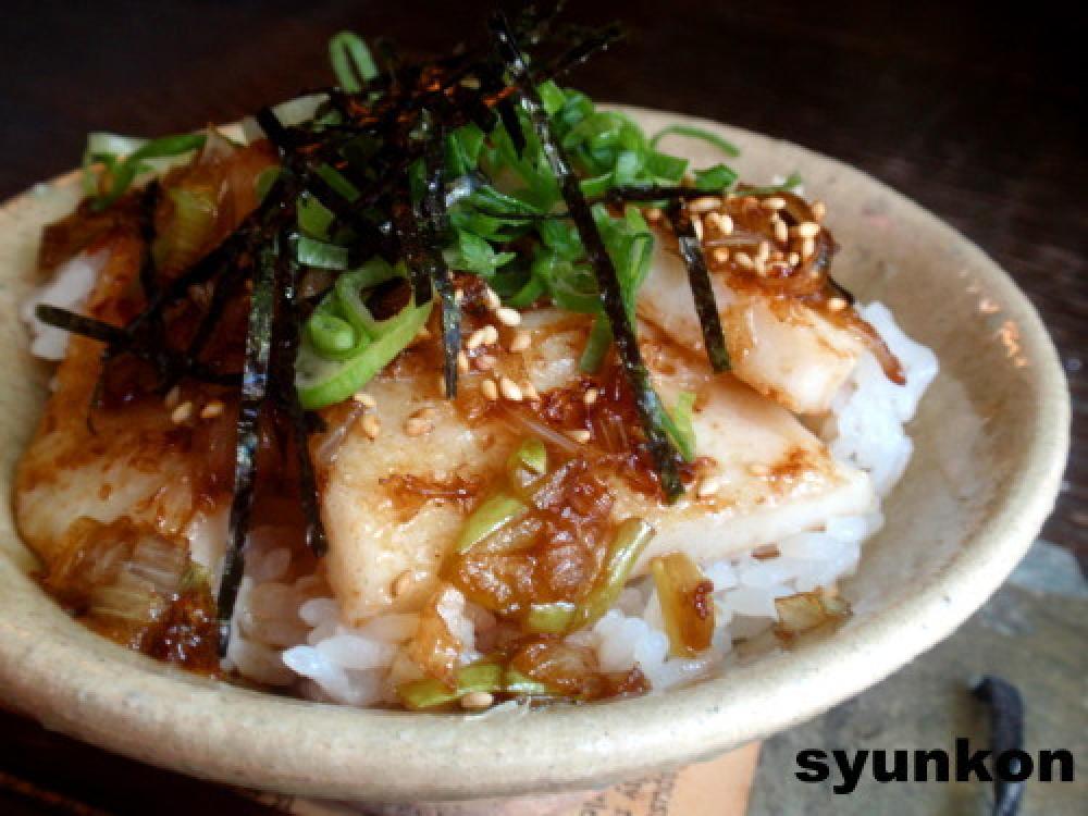 フライパンにバターを溶かしてかまぼこを入れ、両面こんがりと焼き、ご飯に乗せる。