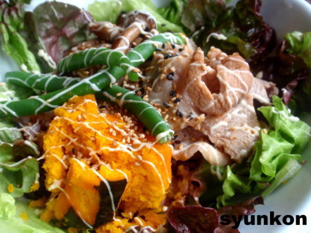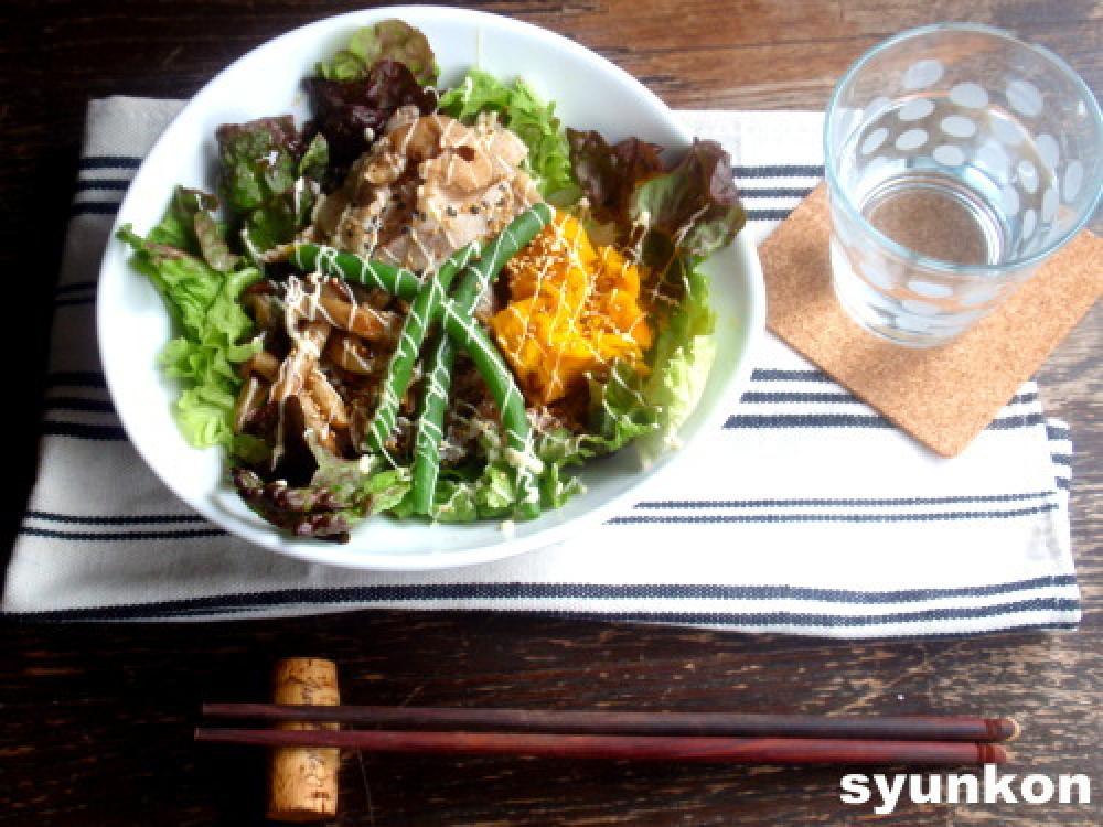 かぼちゃはチンして柔らかくし、少しだけ塩(分量外)をふる。いんげんは茹でる。