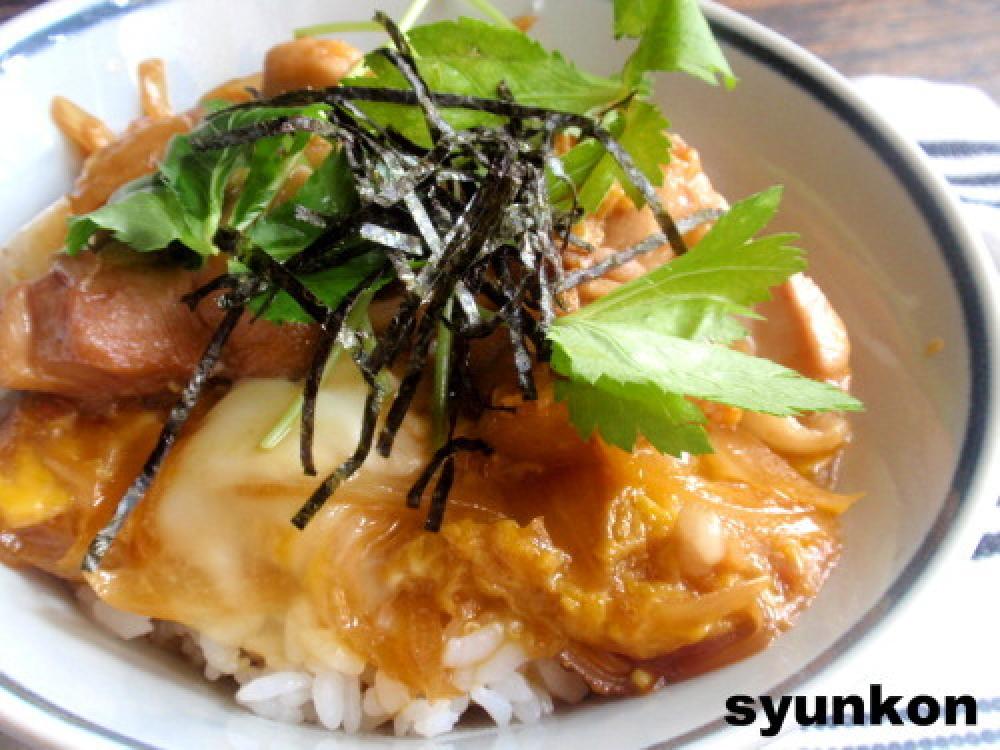鶏肉に火が通ったら、溶いた卵をまわしいれ、すぐ火を止めて蓋をする。