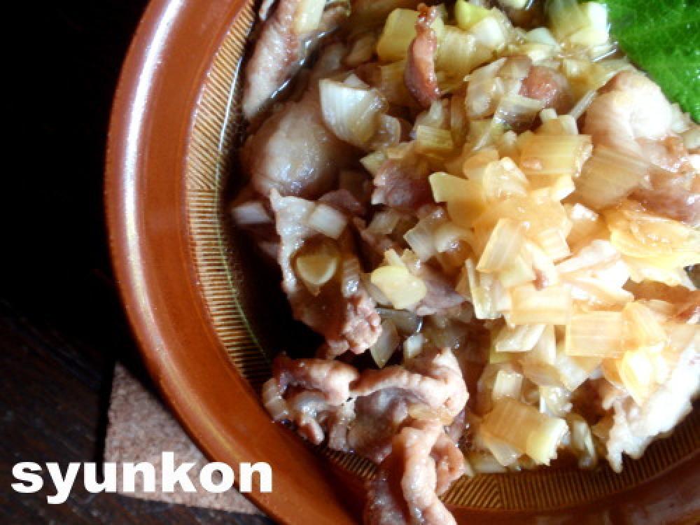 ![]() フライパンに油(分量外)をしき、豚肉を広げて炒め、色が変わったものからポンポンAにつけていく。