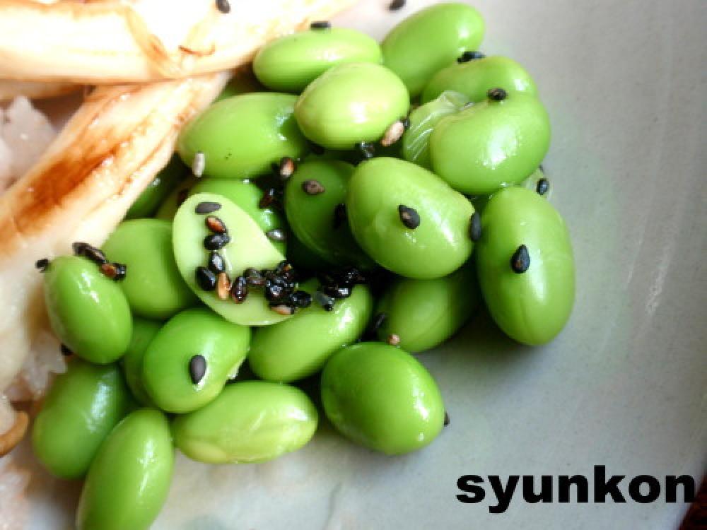 ![]() 味付け枝豆●冷凍の枝豆・・・ひとつかみ(出た)●塩・・・好きなだけ●ゴマ油・・・たらりと●黒ゴマ・・・好きなだけ