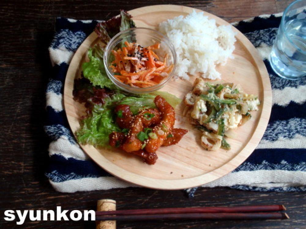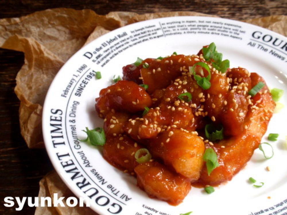 豚ロース肉は細く切ってAをもみこみ、片栗粉をぎゅっとつけて油で揚げ、油を切る。