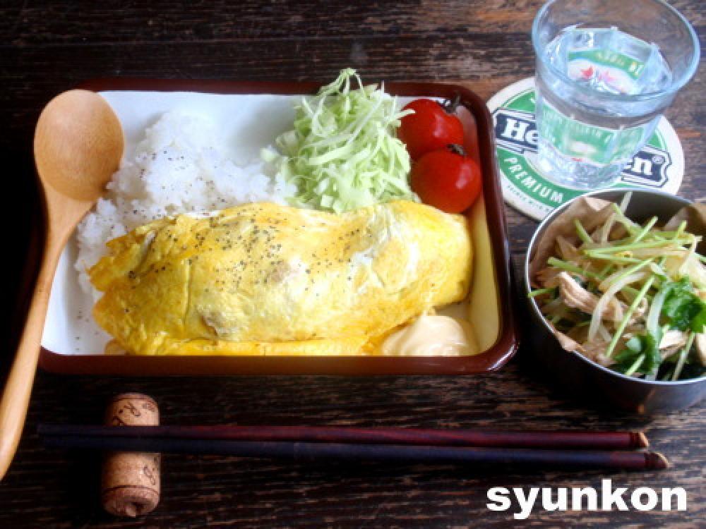 しょうが焼きを乗せ、卵の端をパタンとたたんで、フライパンのへりを利用してお皿にくるんと包んで乗っける。