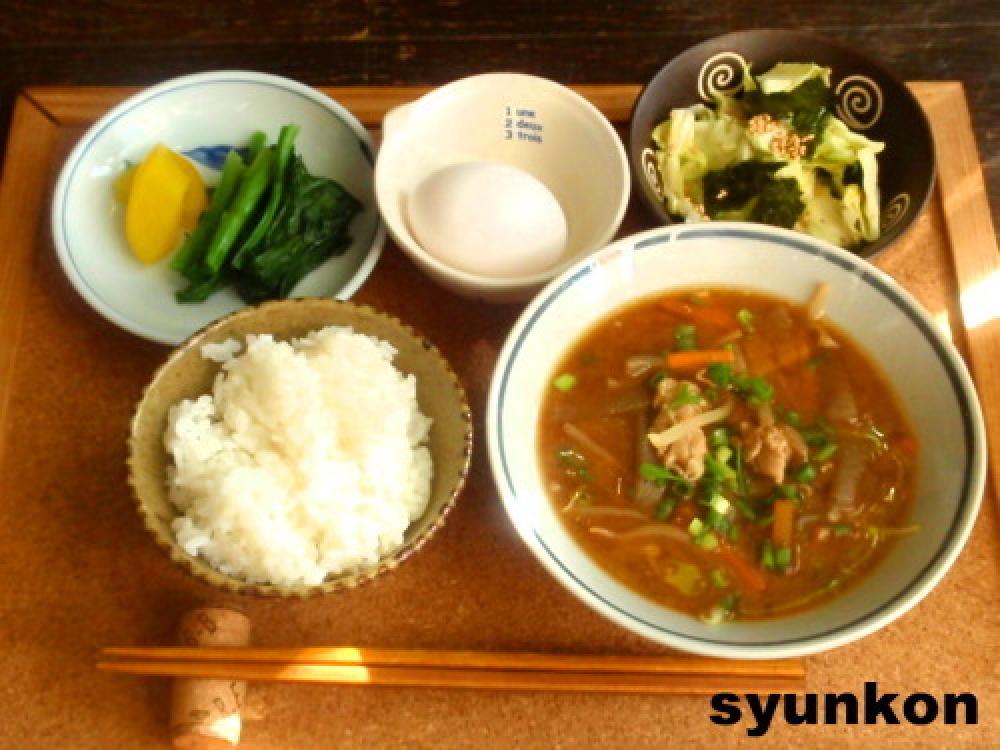 豚肉、油揚げ、こんにゃくを加え、野菜に火が通るまで煮たら最後もやしを入れて煮る。
