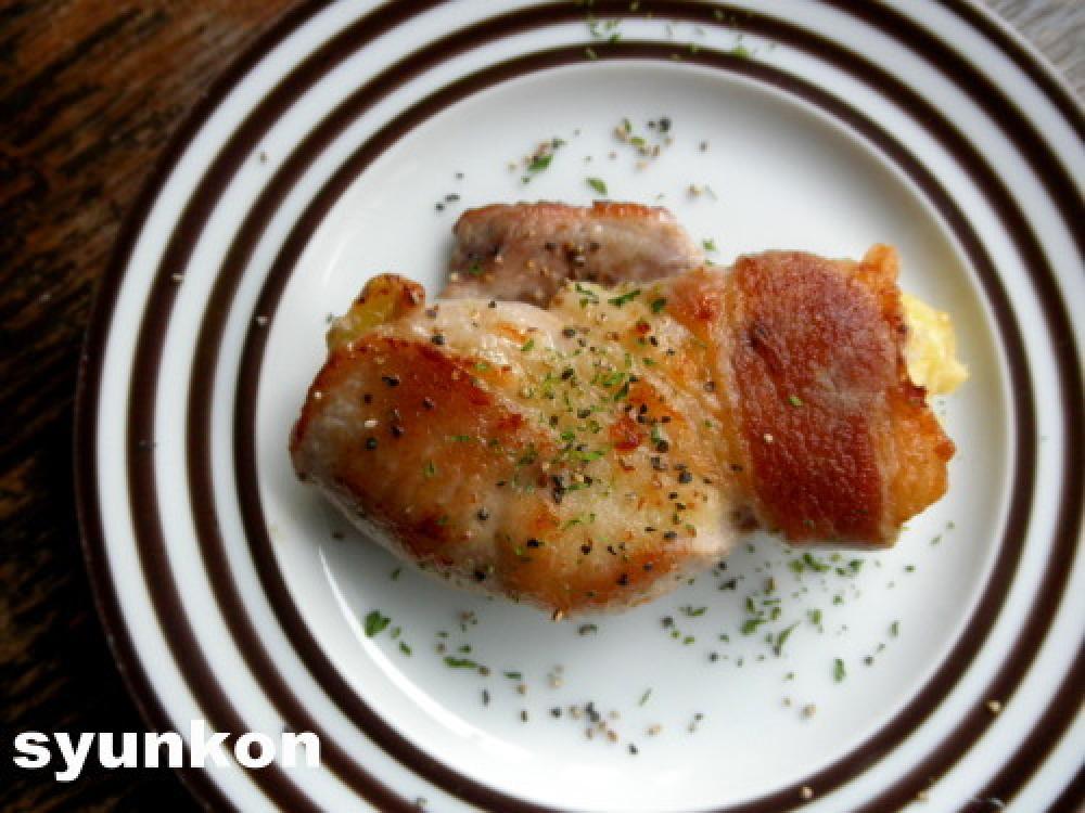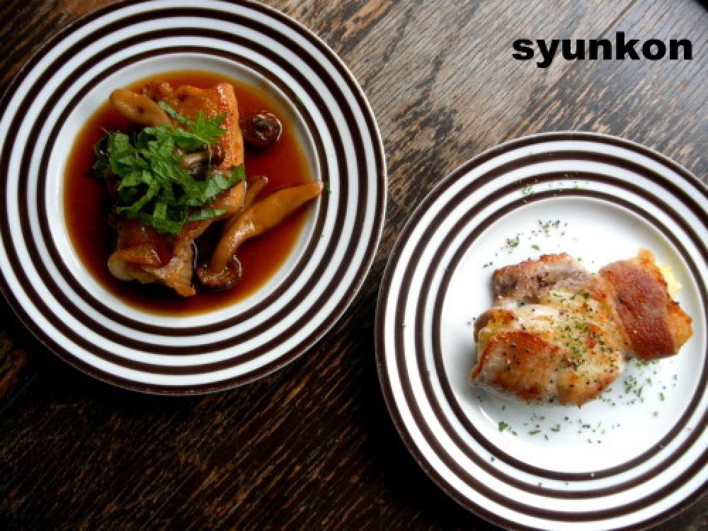 豚肉はたたいて広げ、今のポテトサラダを半量乗せて包み、塩こしょうをふり、小麦粉を薄くはたく。