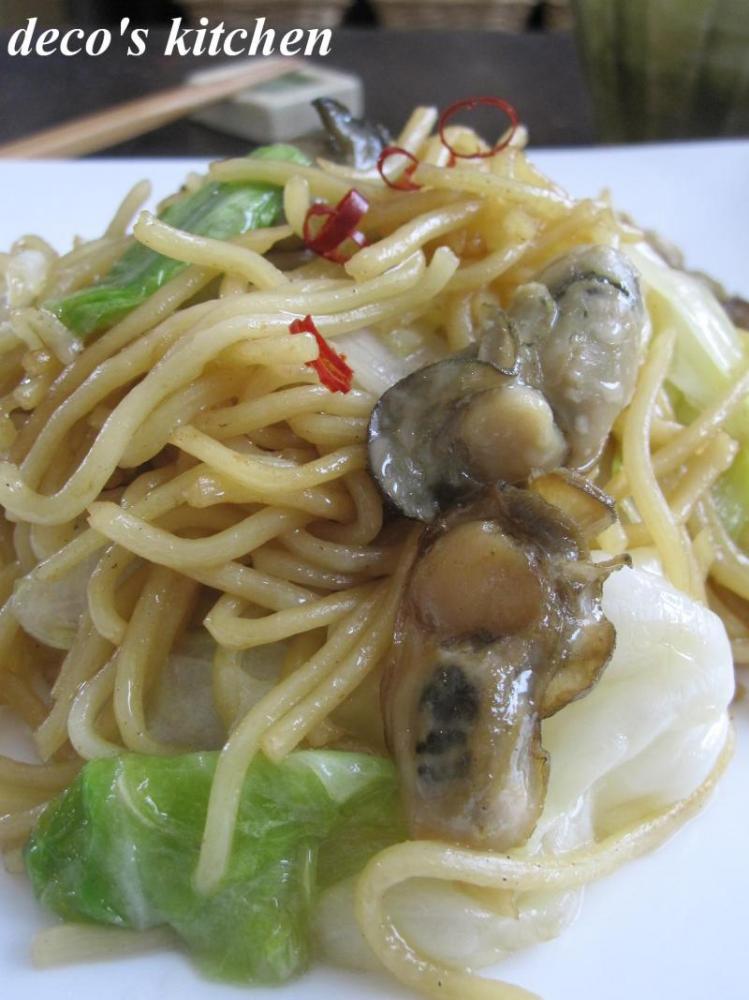 オイル漬けの牡蠣も加え、さっと炒めたら、麺を加え、水大さじ1(分量外)+酒を加えてほぐしながら炒める。
