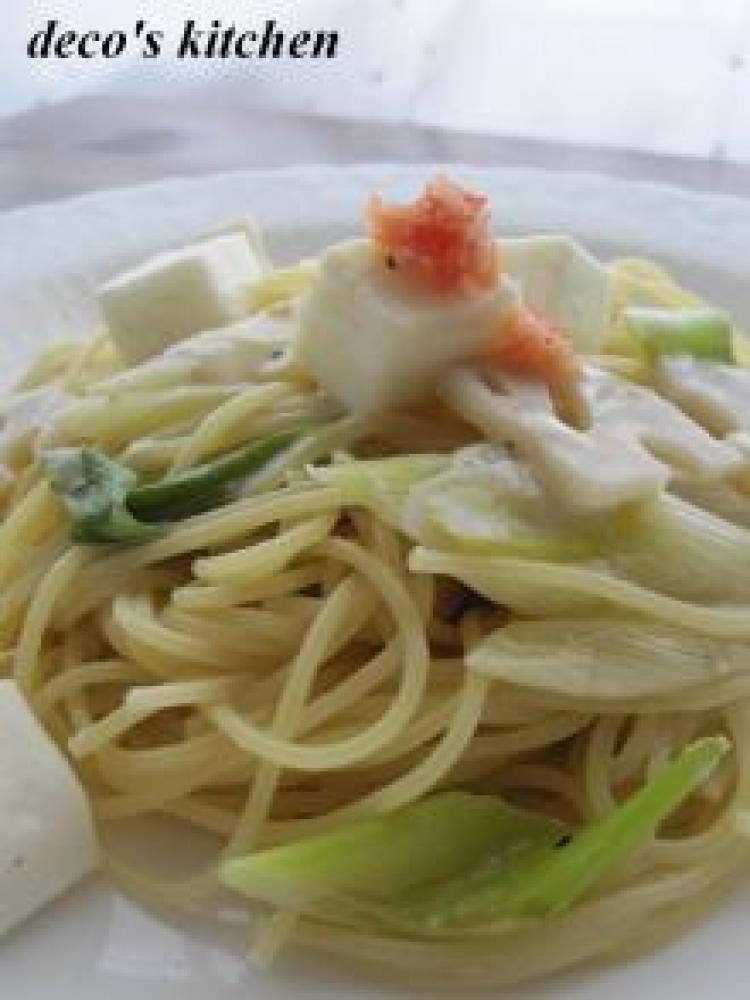 茹で上がったパスタを②に加えて全体を絡めて、完成♪彩りに、明太子をちょこんと乗せるときれい♪