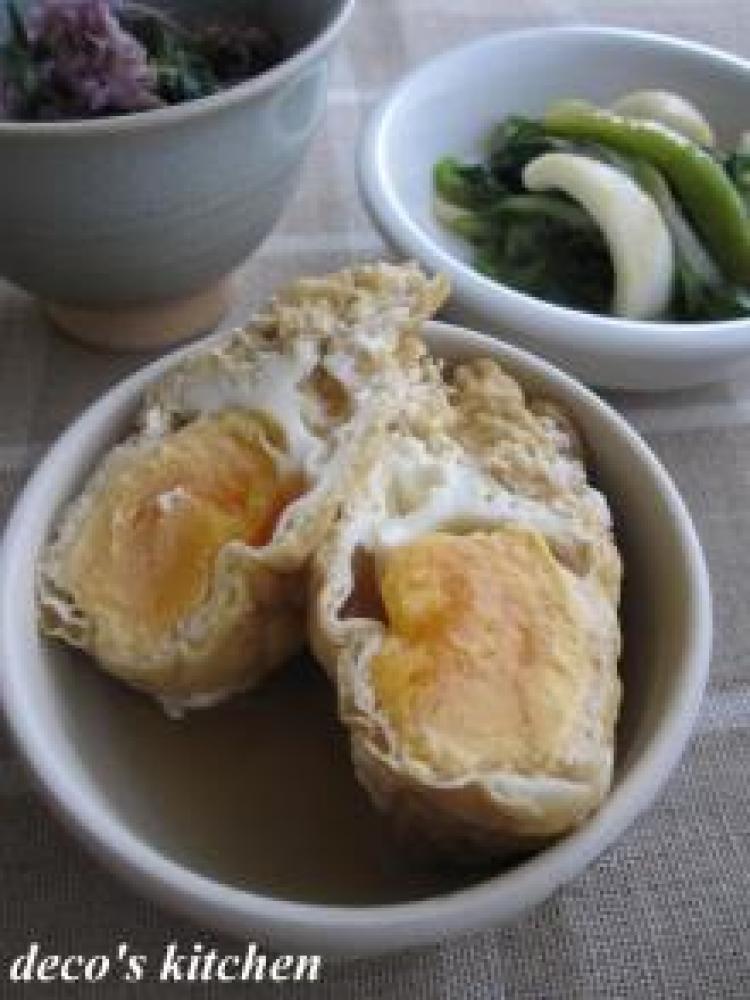 ①の薄揚げの袋に、たまごを1個ずつ割りいれ、ひだをよせて爪楊枝でとめる。(巾着状になるように)